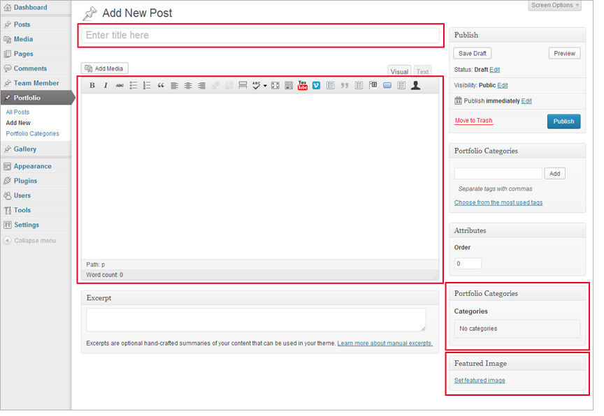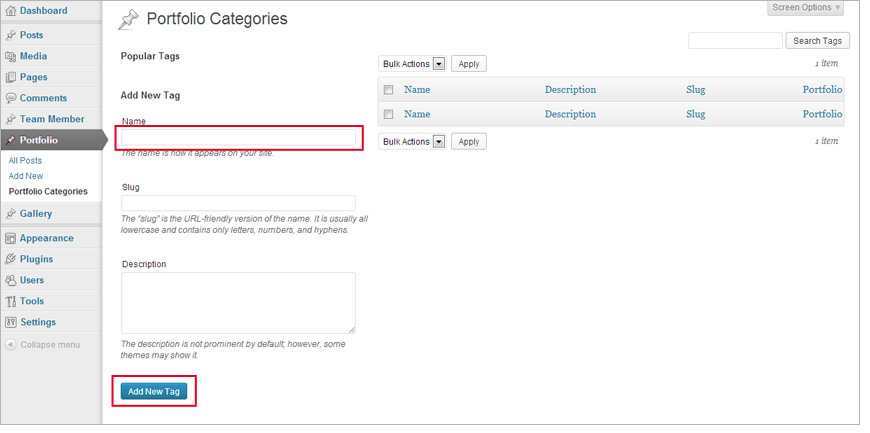 - From the left side menu, under the "Portfolio" menu click to "Portfolio Categories" menu and add to category.